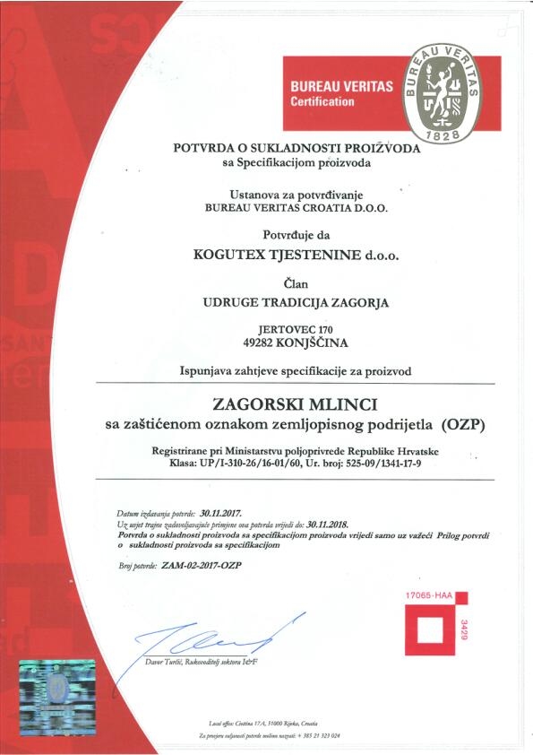 Mlinci se proizvode u pogonu proizvodnje koja ispunjava sve higijenske i zdravstvene norme, HACCP sustav samokontrole i sljedivosti, BV certifikat, oznaka ZOZP i znak Hrvatske kvalitete, samo su jamstvo našim potrošačima da kupuju provjeren i siguran proizvod, koji je rađen po strogoj proizvođačkoj specifikaciji, i dolazi iz određenog zemljopisnog područja. Pogon proizvodnje je u skladu sa svim propisima i normama za proizvodnju prehrambenih artikala, čemu svjedoče svi atesti i projekti, koji su bili potrebni da se proizvodnja vrši na siguran i zdrav način. Proizvodnja se odvija pod stalnim video nadzorom. Zagorski mlinci i Rustikalni mlinci mogu se upotrijebiti 12 mjeseci od datuma proizvodnje tj. do označenog datuma koji je otisnut na svakom pojedinačnom pakiranju, a kakvoća i kvaliteta mlinaca, a tako i sama analiza kiselinskog stupnja i postotak vlage, redovito se kontroliraju od strane Laboratorija za analitičku kemiju kod Instituta u Križevcima i Zavoda za javno zdravstvo u Zaboku.