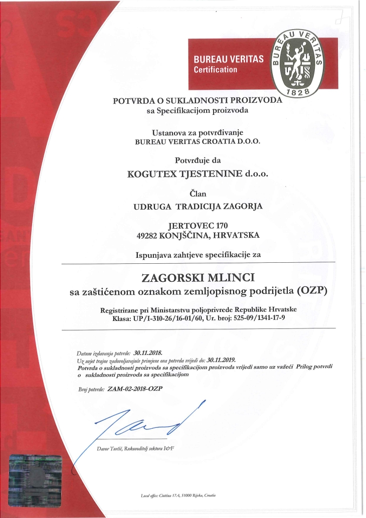 ''KOGUTEX Tjestenine '' d.o.o. proizvodi dvije vrste mlinaca, zagorski mlinci 500gr i rustikalni mlinci 500gr.