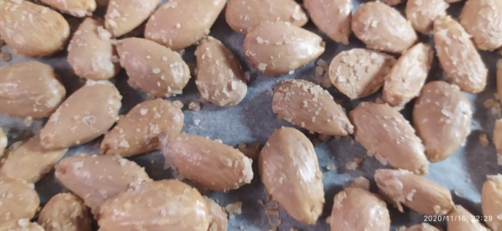 Domaći oguljeni bademi, zaslanjeni i zagrijani u pećnici. Vrhunski domaći snack.