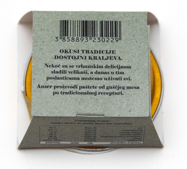 Delikatesni pate s 32% gušćeg mesa, obogaćena finim tartufima i pomno biranim začinima.