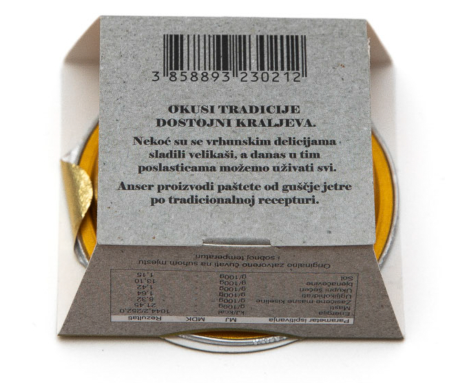 Fino mljeveni pate s 25% guščje jetre, obogaćena hladno prešanim bučinim uljem i aromatičnim