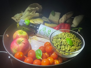 Tikvicu, papriku, korijen celera, gljive i piletinu oštrim nožem narežite na kockice. Cherry pomidor razrežite na polovice. Na zagrijano maslinovo ulje prvo na srednje jakoj vatri prvo stavite pržiti piletinu, na nju stavite pola čajne žličice cvijeta morske soli i pola čajne žličice friško samljevenog zelenog papra, nakon nekih 5 minuta kad je meso pobijelilo i počelo mjestimice dobivati smećkaste tonove u tavu dodamo cherry pomidor, korijen celera, tikvicu i papriku. Sve to pržimo uz lagano miješanje nekih desetak minuta pa zatim dodamo gljivu bukovaču narezanu na kockice, te nastavimo lagano miješati. Nakon 5 do 7 minuta dodamo 4 do 5 šaka riže pa sve lagano miješamo.