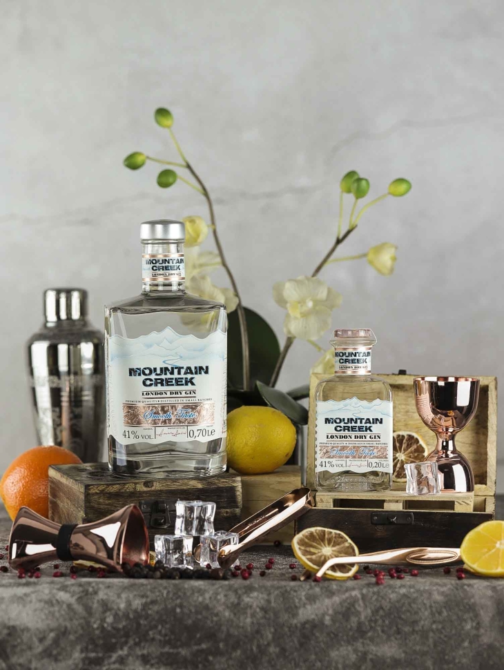 GIN Mountain Creek london dry gin je premium craft gin nastao od vrhunskog pšeničnog destilata, pažljivo odabranog bilja i meke planinske izvorske vode. Baza gina je premium pšenični destilat, destiliran kroz sedam kolona, savršeno neutralan i idealan za proizvodnju premium gina. Gin je proizveden od 29 vrsta pažiljivo odabranog aromatičnog bilja, pa osim tradicionalnog bilja poput borovice, angelike, korijandera, lavande, kadulje, matičnjaka, slatkog korijena i drugih biljaka, poseban naglasak stavljen je na citrusne arome limuna i naranče koje ovom ginu daju posebnu voćnost i svježinu. Sve to zajedno destilirano je i pomiješano sa vrhunskom izvorskom vodom prirodno filtiranom kroz slojeve stijena starijih od 600 milijuna godina iz Geoparka Papuk, koja u konačnici ovom ginu daje apsolutnu mekoću na okusu, te ga čini savršenim i bez miješanja sa tonicom.